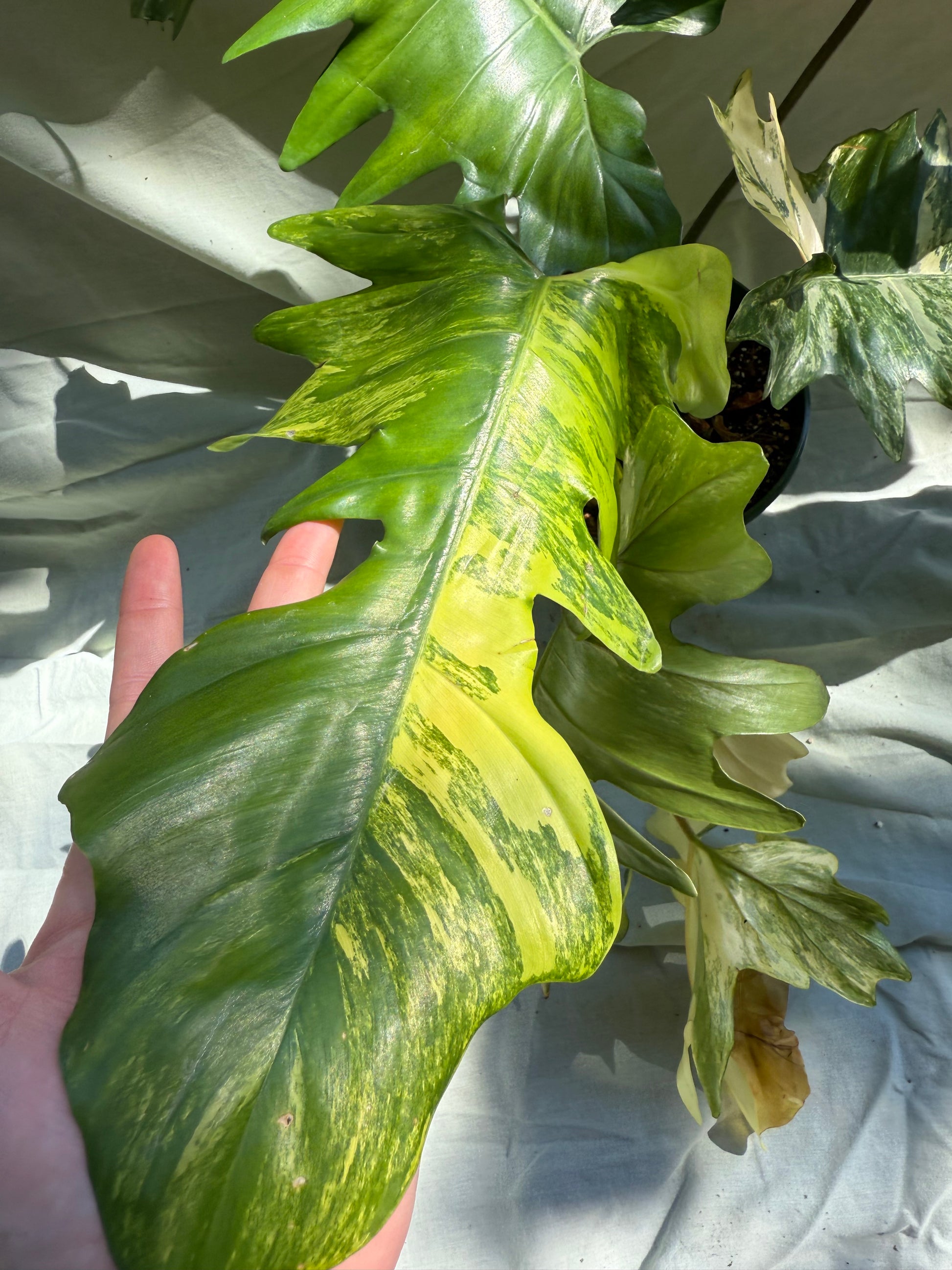 Meet one of the newest and most striking hybrids in the tropical plant world — the Philodendron Florida Beauty × Mayoi, an extraordinary cross that combines the intricate variegation of Florida Beauty with the dramatic lobed structure of Mayoi. The result is a plant that’s both refined and wildly expressive, with each leaf displaying a unique fusion of creamy white, mint, and emerald marbling against deep, glossy green tones.